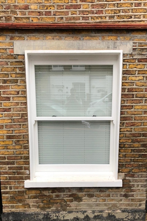 Once the order was ready we set to work, carefully removing and replacing the original sashes and front door. The internal finishing was carried out using window board and architraves, while a neat cement fillet was added on the outside.